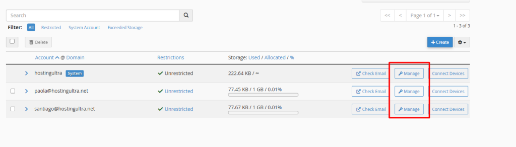 En la misma fila de la cuenta correspondiente, haz clic en Manage. Esto abrirá la pantalla de administración de esa cuenta de correo, donde podrás modificar su configuración