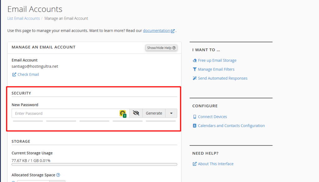 Cambiar la contraseña de una cuenta de correo en cPanel es un proceso sencillo que se realiza desde Email Accounts, entrando en Manage y luego en la sección Security.