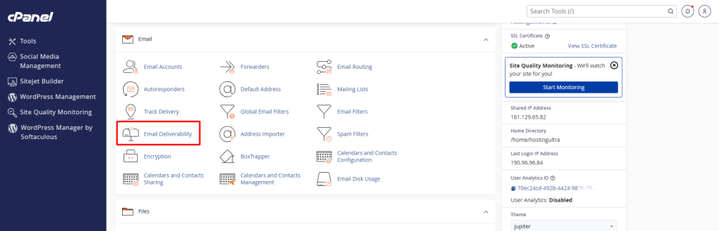 Dentro de cPanel, dirígete a la sección de correo y haz clic en Email Deliverability.