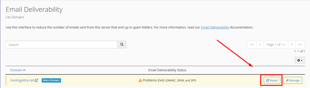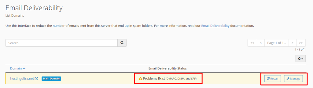 Si cPanel detecta errores o valores incompletos, te mostrará opciones como Repair o Manage para corregirlos o revisarlos en detalle.