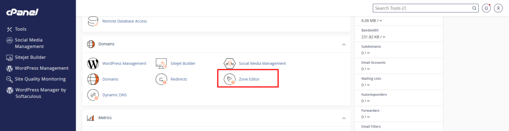Ve a la sección Domains y abre Zone Editor. Esta es la interfaz adecuada para actualizar registros DNS como TXT, incluyendo SPF, DKIM y DMARC, cuando necesites gestionarlos manualmente.