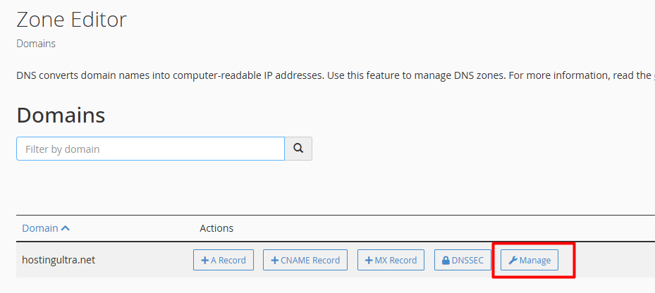 Busca el dominio que deseas modificar y haz clic en Manage.