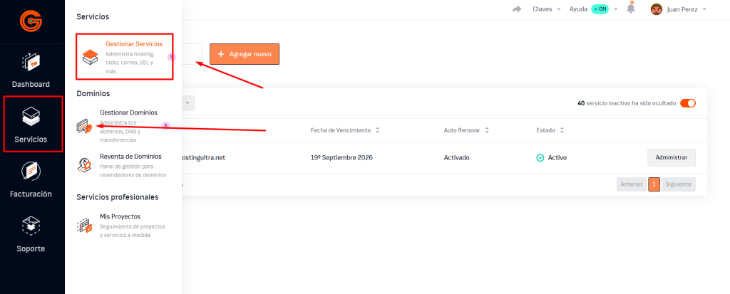 Una vez dentro de tu área de cliente, dirígete al menú lateral izquierdo y haz clic en Servicios > Gestionar servicios.