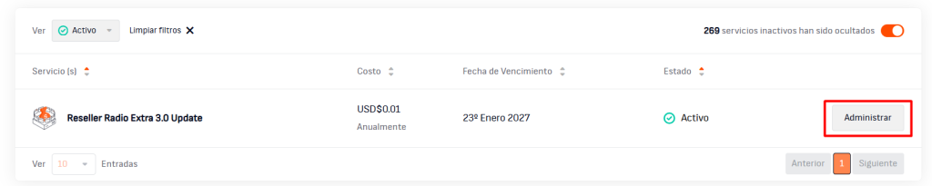 Al ingresar a Gestionar servicios, verás una tabla con el listado de los servicios contratados.