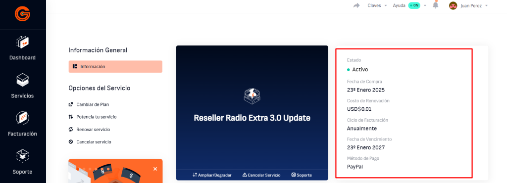 Esta información te permite entender mejor cómo está configurado el servicio y cuál será su próxima renovación.