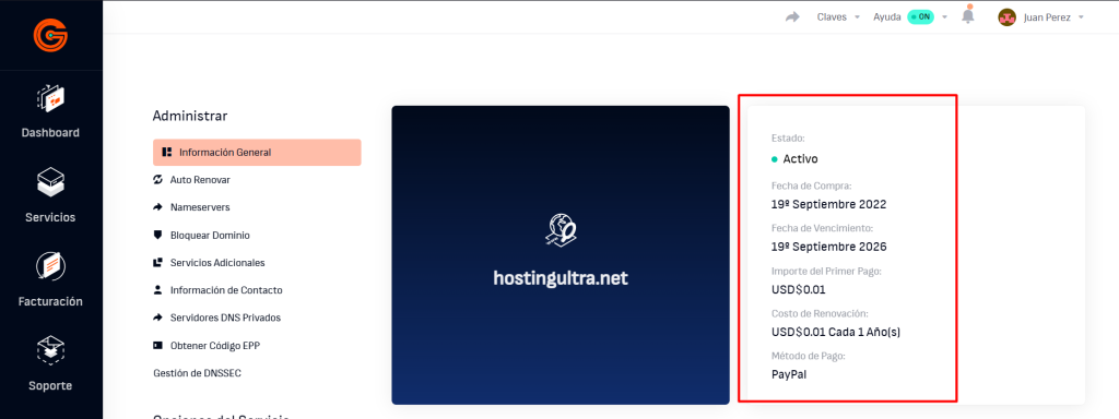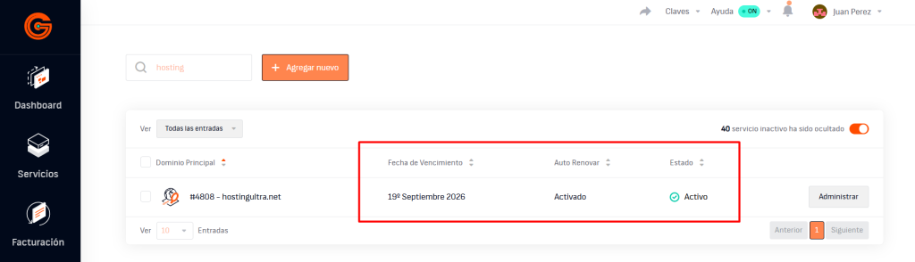 Desde tu área de cliente puedes revisar fácilmente la fecha de vencimiento, el estado y la configuración de autorrenovación de tus dominios registrados.