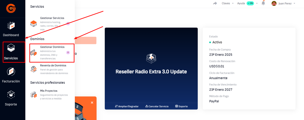 Una vez dentro de tu área de cliente, dirígete al menú lateral izquierdo y haz clic en Servicios > Gestionar Dominios.