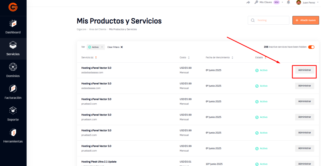 Se mostrará una lista con todos tus servicios activos. Si tienes varios, ubica el que deseas revisar y haz clic en el botón Administrar.