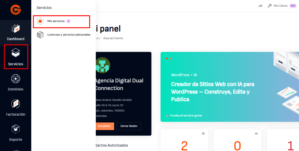Una vez dentro, en el menú principal selecciona la opción Servicios y luego haz clic en Mis servicios.