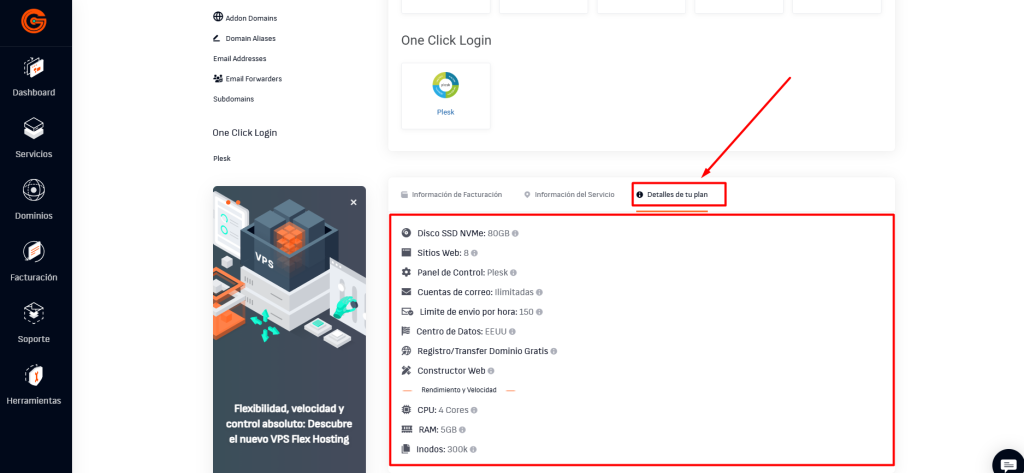 En la parte inferior de la página, verás varias pestañas. Haz clic en Detalles de tu plan para ver información sobre tu plan actual.