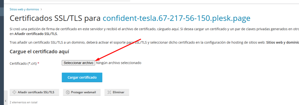 1. Dentro de Certificados SSL/TLS, busca la opción Cargar los archivos del certificado.