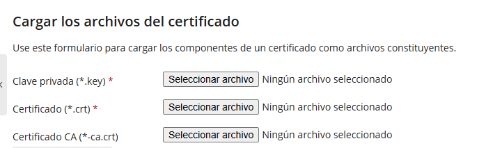 • Algunos certificados incluyen también un CA Bundle o certificado intermedio. Si lo tienes, añádelo en el campo CA certificate durante la carga.