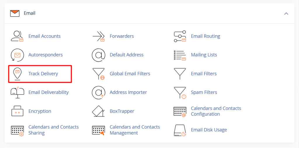 Dentro de cPanel, dirígete a la sección de correo y haz clic en Track Delivery. En algunas instalaciones puede aparecer traducida como Monitorizar el envío.