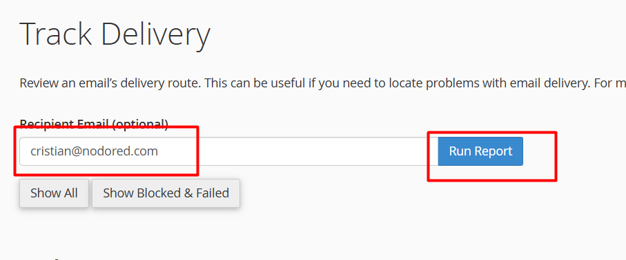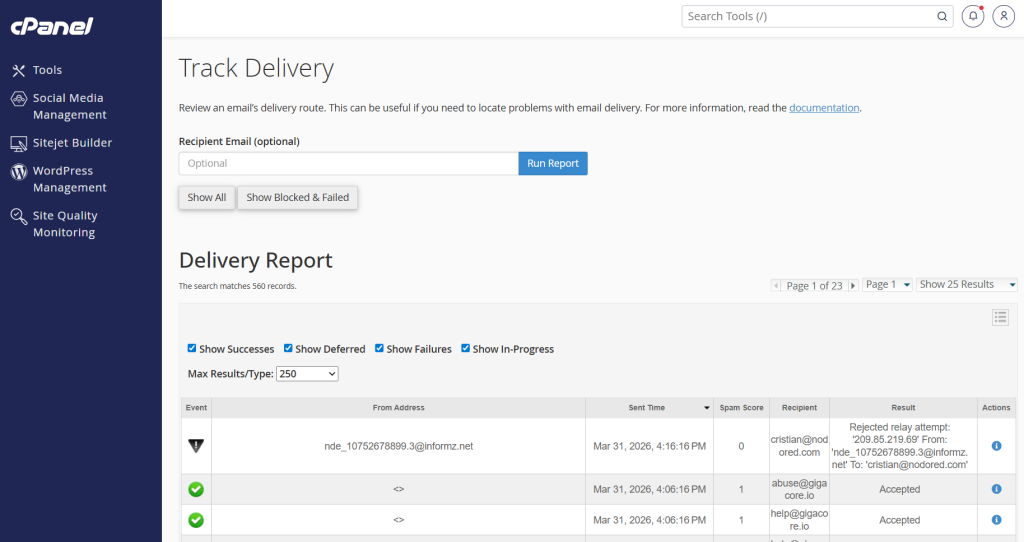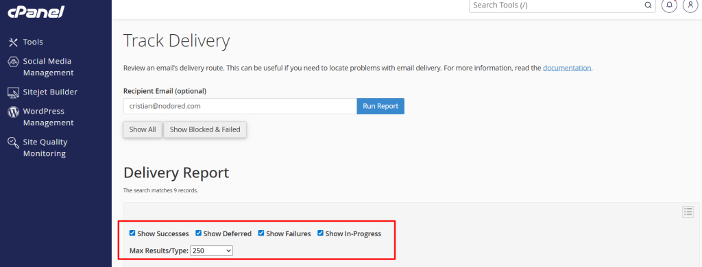 Si deseas ver todos los resultados nuevamente, elimina el correo ingresado y vuelve a ejecutar el reporte. cPanel también ofrece opciones como Show All o filtros orientados a mostrar solo fallos.