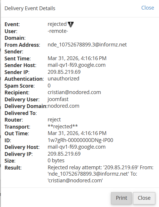 En la columna Actions, haz clic en el icono de información para abrir el detalle del correo. Desde allí podrás ver información adicional del envío e incluso imprimirla si lo necesitas. Este detalle puede incluir datos como el remitente, el destinatario y el usuario asociado al mensaje.