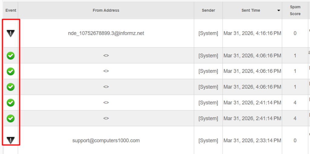 La columna Event utiliza iconos para representar el estado de entrega del mensaje. Algunos de los estados que puedes encontrar son: