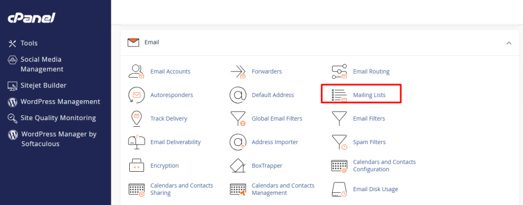 Dentro de cPanel, dirígete a la sección Email y haz clic en Mailing Lists. Esta interfaz permite crear listas de correo y acceder a su administración.