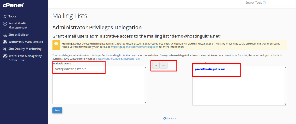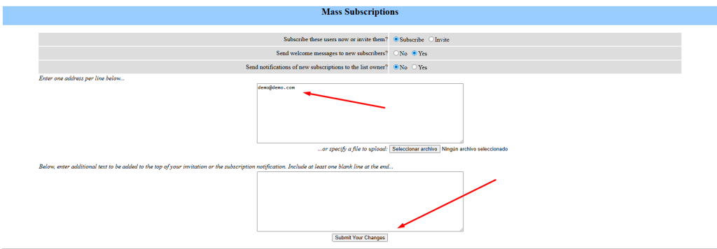 Una vez que agregues las direcciones necesarias, guarda los cambios desde el botón correspondiente en la interfaz de Mailman.