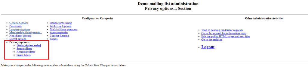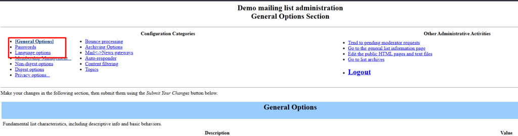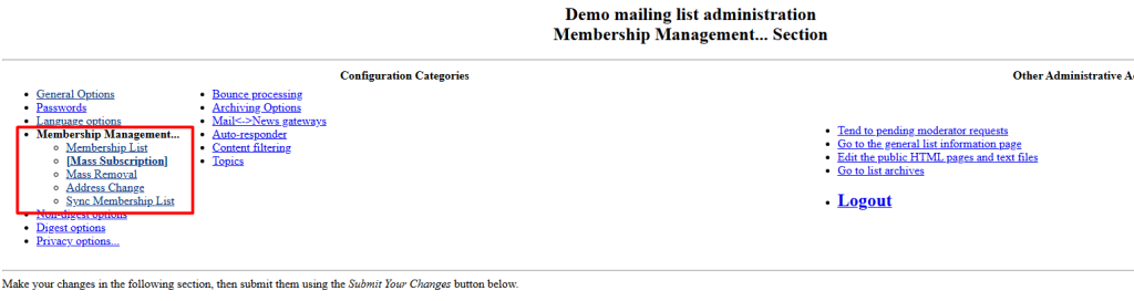 Cuando haces clic en Manage, cPanel te redirige a la interfaz administrativa de Mailman, donde se encuentran las opciones avanzadas de gestión. Desde esta interfaz puedes agregar o quitar direcciones y configurar las opciones de la lista.