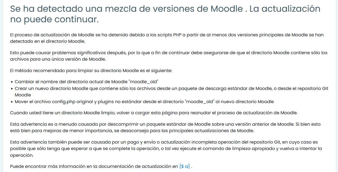 1. Completar la Actualización: Puede finalizar el proceso de actualización siguiendo los pasos o recomendaciones proporcionados por Moodle en el error que adjuntó. Es crucial contar con la asistencia de su webmaster para llevar a cabo esta tarea. En caso de no tener un webmaster local disponible, recuerde que Nodored ofrece un servicio de webmaster remoto, el cual puede consultar aquí: https://nodored.com/clientes/store/webmaster-remoto